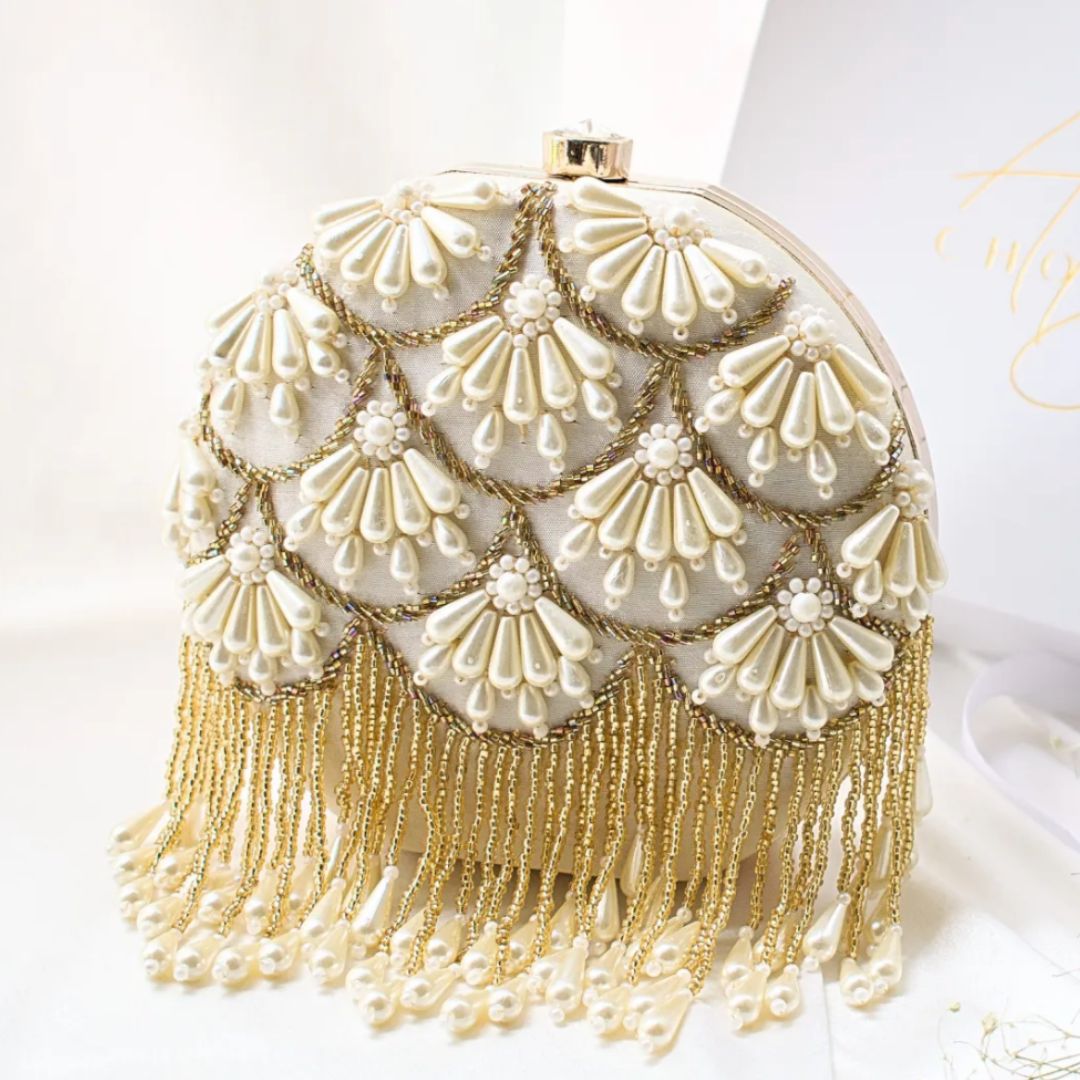 Expertly hand-embroidered on rich Taffeta Silk, this exquisite clutch is adorned with delicate seed beads, pearls, and pearl drops, creating a radiant blend of tradition and modern luxury. The intricate detailing and shimmering finish make it an ideal companion for weddings, festive celebrations, and evening soirées.